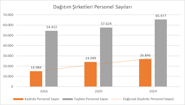 2016 yılında elektrik dağıtım şirketlerinde çalışan toplam personel sayısı 54.412 iken bu sayı 2024 yılında yaklaşık %20’lik artış ile 65.477 ‘ye ulaşmıştır.